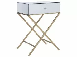 Añade glamour a tu sala de estar o dormitorio con esta mesa auxiliar. Está fabricada a partir de vidrio de alta calidad. Puedes utilizar el cajón para guardar las pertenencias y tenerlo todo a mano. El acabado de efecto espejo y el pomo de cristal combinan funcionalidad con un diseño moderno. Ideal como mesa de noche o situada junto al sofá.